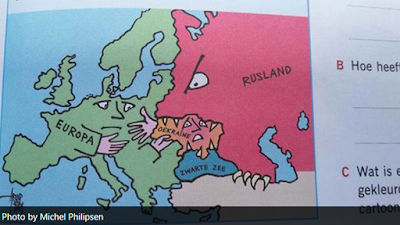 Dans un manuel néerlandais d’études sociales pour des adolescents de 16 ans, la Russie a été dessinée comme un monstre muni de griffes et de crocs, qui essaye de s’emparer de l’Ukraine tandis que l’UE lui tend la main.
