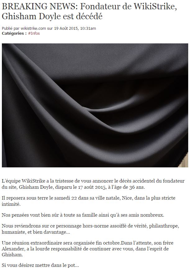 Ce n'est pas dans mes habitudes de faire ce genre d'article mais cette manipulation de masse n'a que trop duré. Le 19 août dernier, Wikistrike a annoncé la mort de son admin Ghisham Doyle tout en faisant un appel aux dons en fin d'article. J'ai trouvé cela particulièrement étonnant de faire un appel aux dons dans pareilles circonstances.