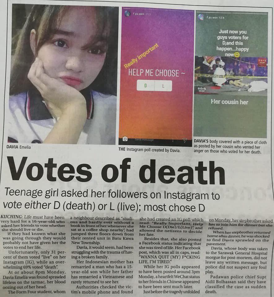 "C’est très important, aidez-moi à choisir : V(ivre) ou M(ourir)" : c’est avec ces quelques mots que Davia Emelia, une adolescente malaisienne, a demandé aux internautes qui la suivaient sur Instagram de choisir si elle devait mettre fin à ses jours ou non.